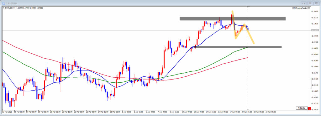 4時間足では、最高値を作った押し目をブレイクし下降トレンド初動で戻り高値にいるポイント。